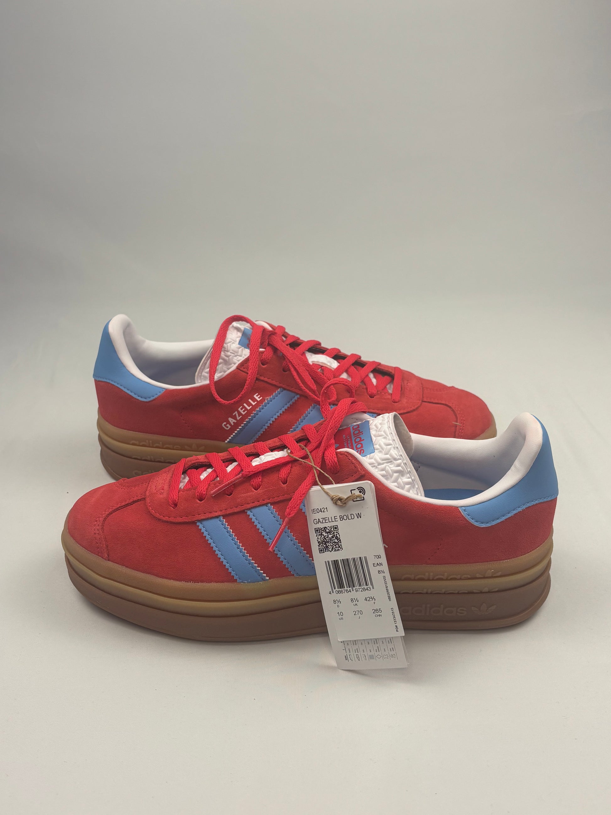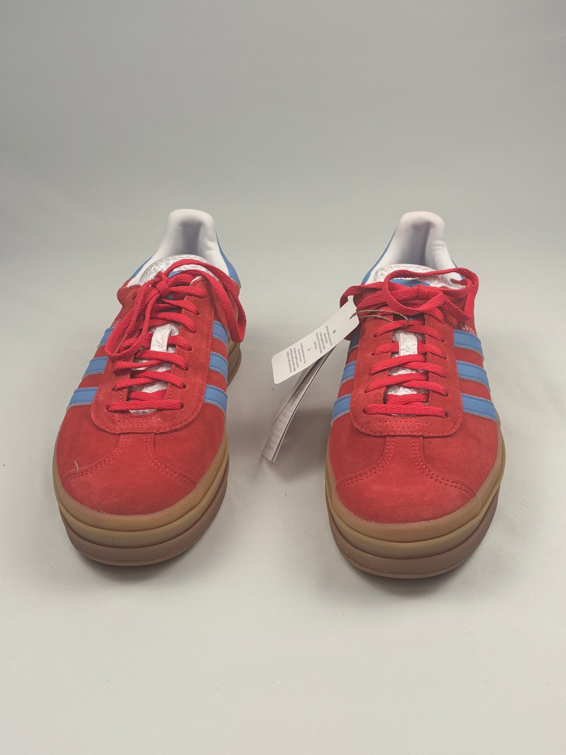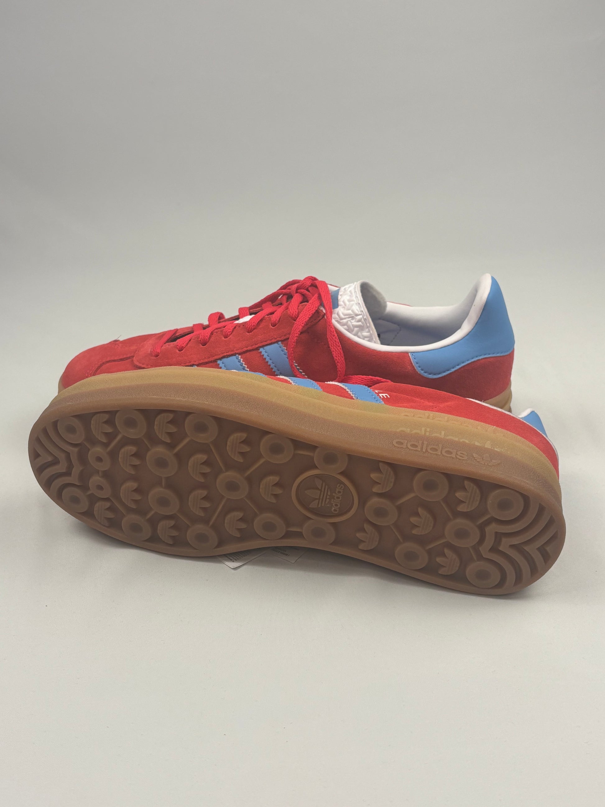 Adidas Gazelle Bold W in knallrot mit blauen Streifen, chunky Plateausohle und Retro-Vibes pur. Super bequem, top verarbeitet und ein echter Hingucker für Sneaker-Fans.