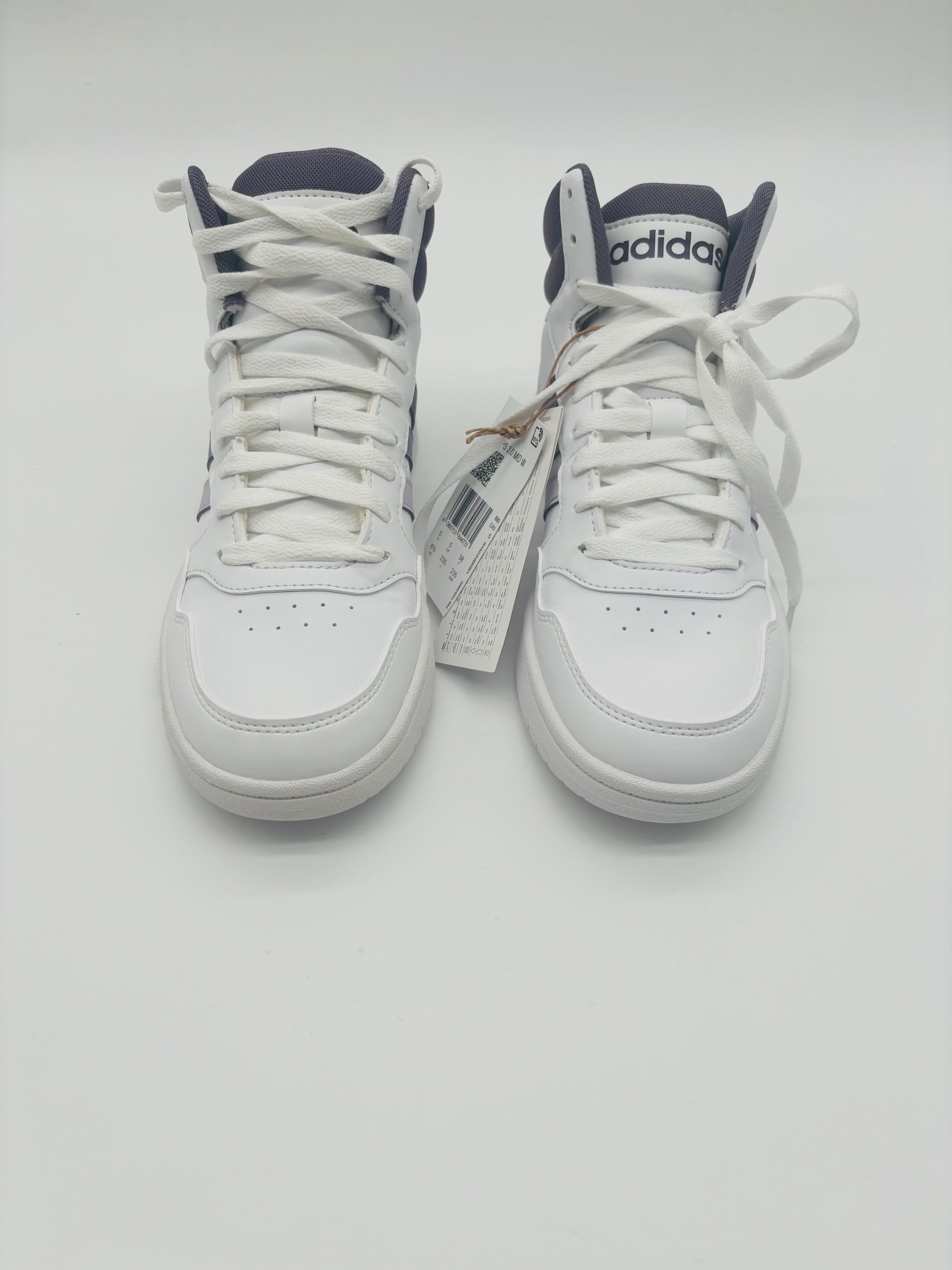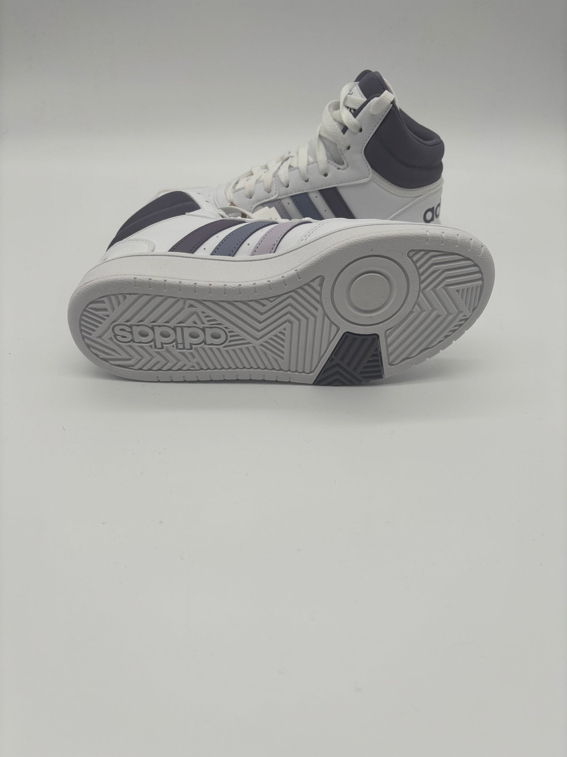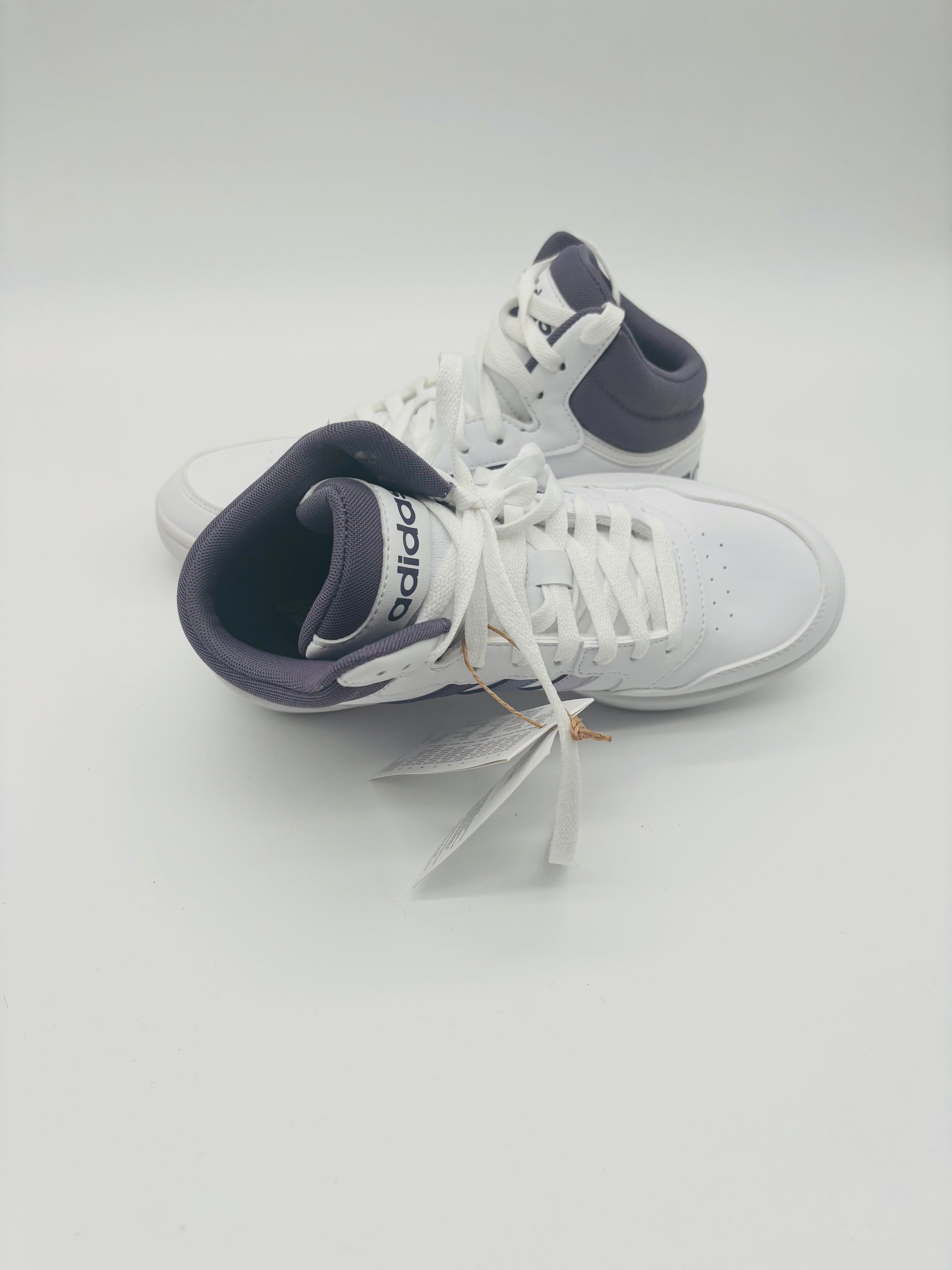 Stylischer Mid-Cut-Sneaker im Basketball-Look mit violetten Streifen. Weißes Synthetikleder, gepolsterter Einstieg und griffige Gummisohle – ideal für Streetwear oder Alltag.
