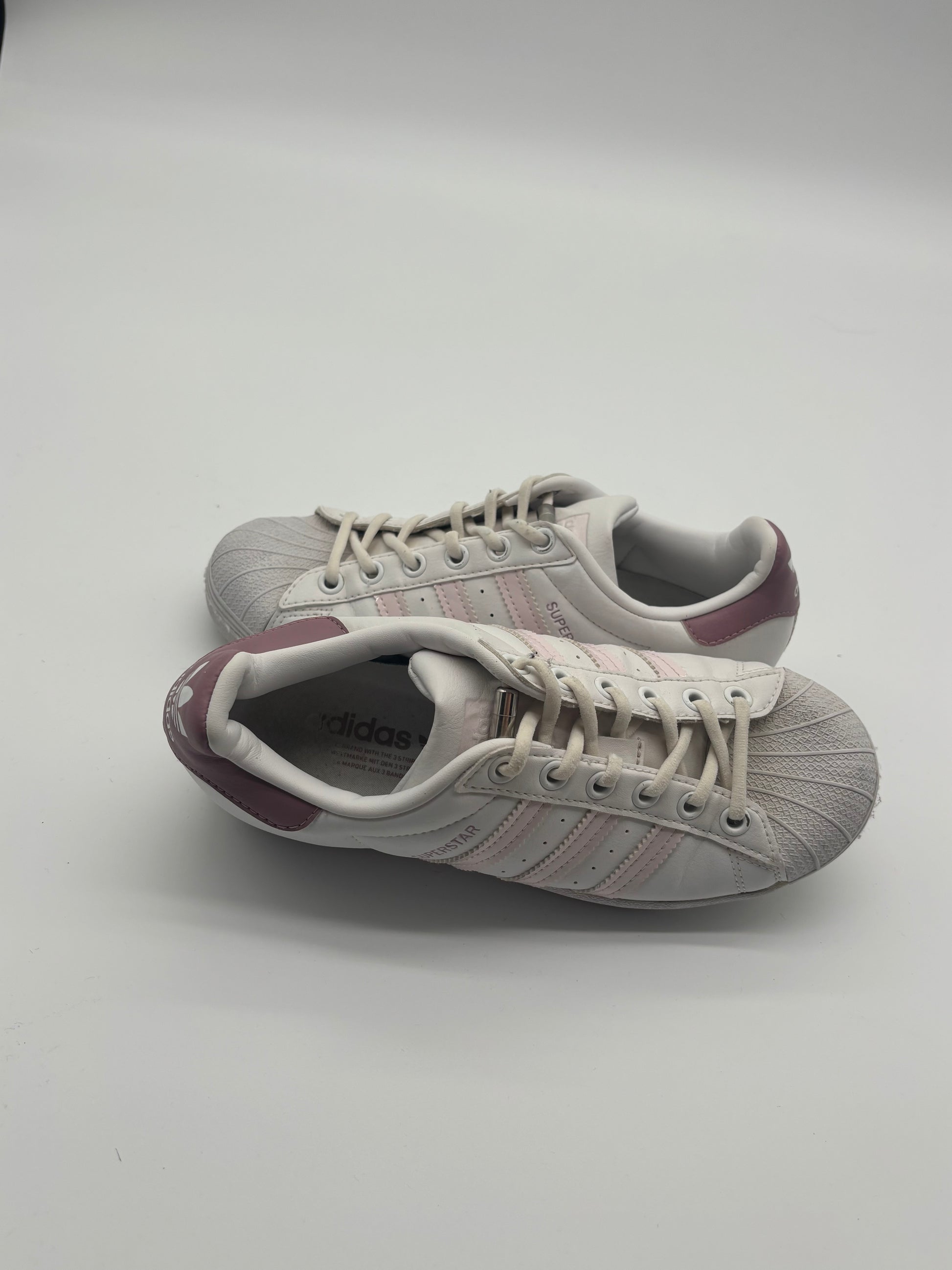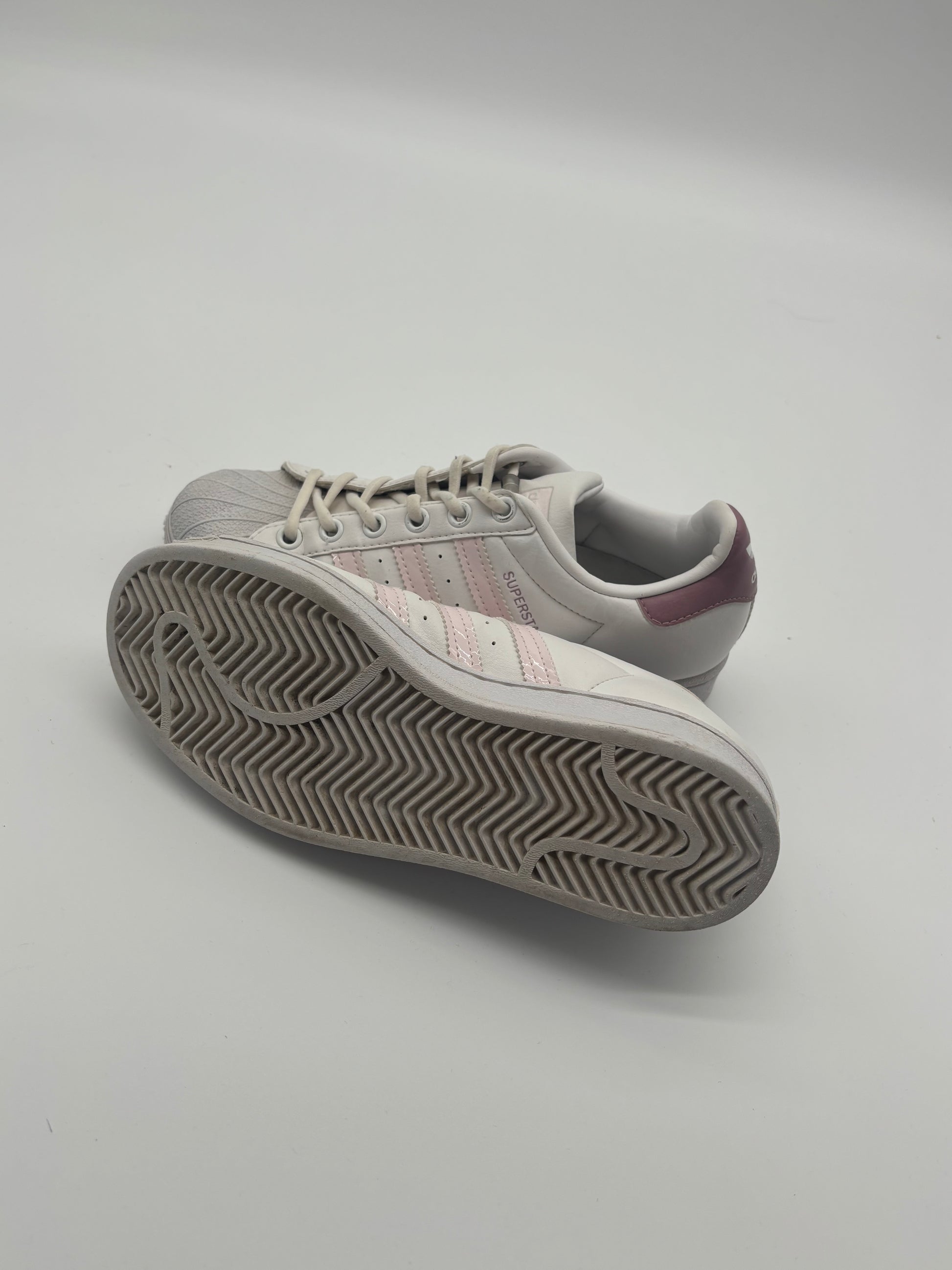 Die legendären adidas Superstar in Weiß mit zarten rosa Streifen und bordeauxroten Details bringen sportlichen Style mit femininer Note. Die robuste Shell Toe-Kappe und das hochwertige Leder-Obermaterial machen sie langlebig und alltagstauglich – perfekt für Freizeit, Streetwear oder Casual-Looks.