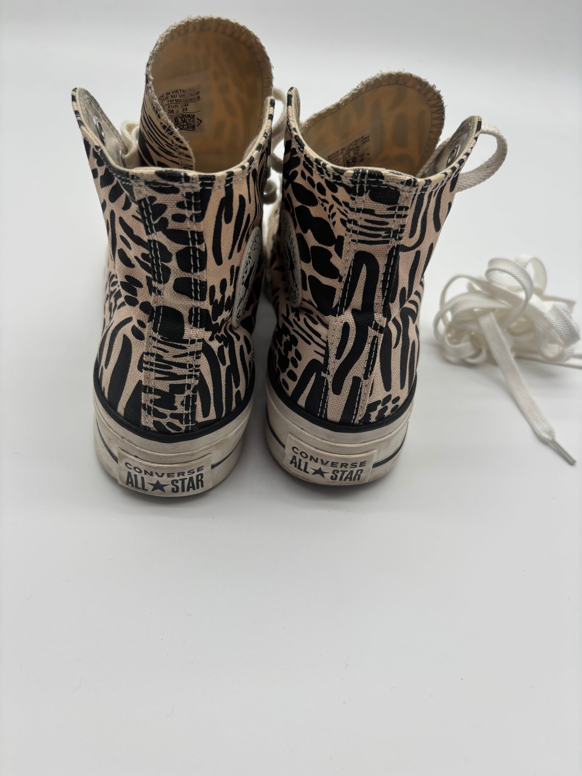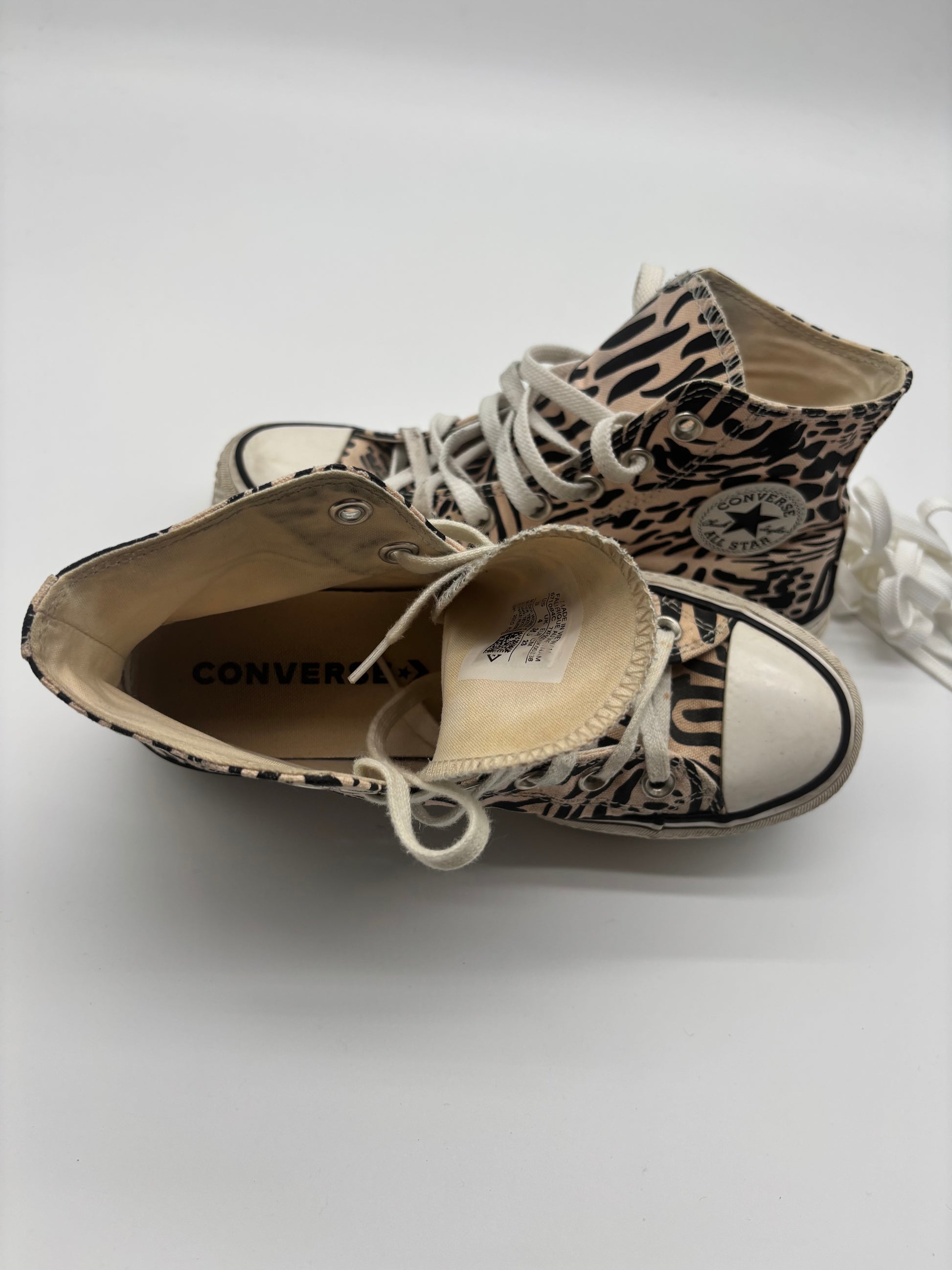 Auffälliger Converse Chuck Taylor All Star High-Top im Animal-Print. Das extravagante Muster in Beige und Schwarz macht diesen Sneaker zum absoluten Blickfang. Typisches Converse-Design mit robuster Gummisohle, Zehenkappe und seitlichem Logo-Patch. Ideal für alle, die ein Statement setzen möchten.