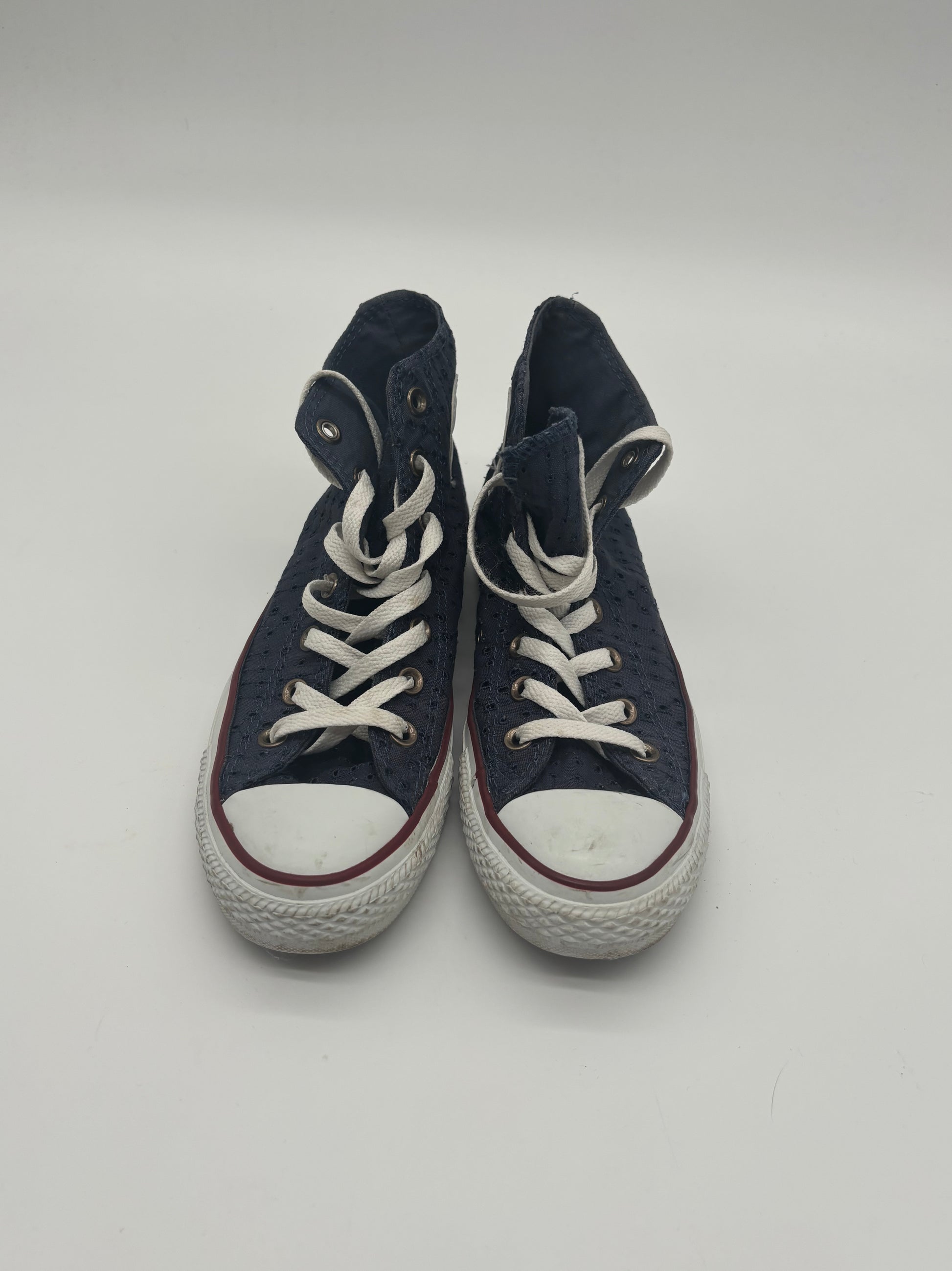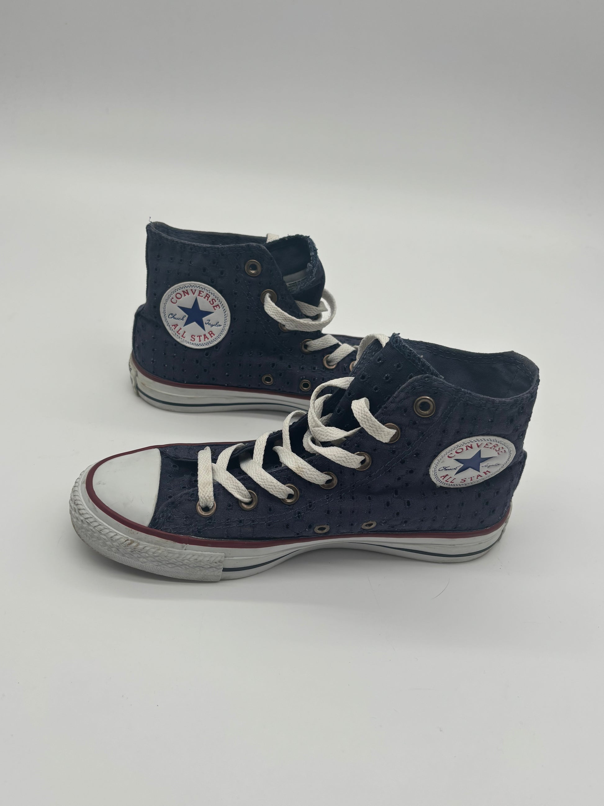 Converse Chuck Taylor All Star High-Top in Dunkelblau mit besonderem Twist: Das Obermaterial ist mit einem strukturierten Punktmuster versehen, das dem klassischen Design einen individuellen Look verleiht. Weiße Schnürsenkel, eine robuste Gummisohle mit roten und blauen Linien sowie das legendäre Converse-Logo an der Seite runden den Style ab.