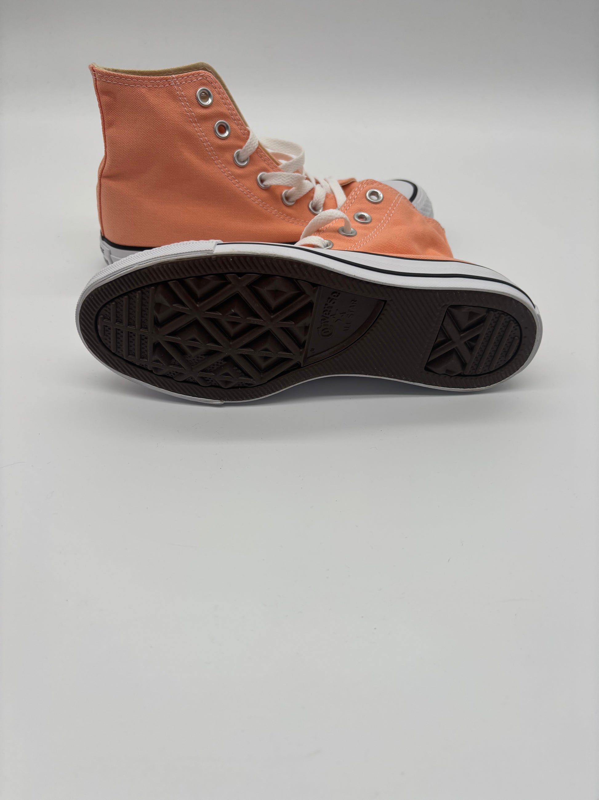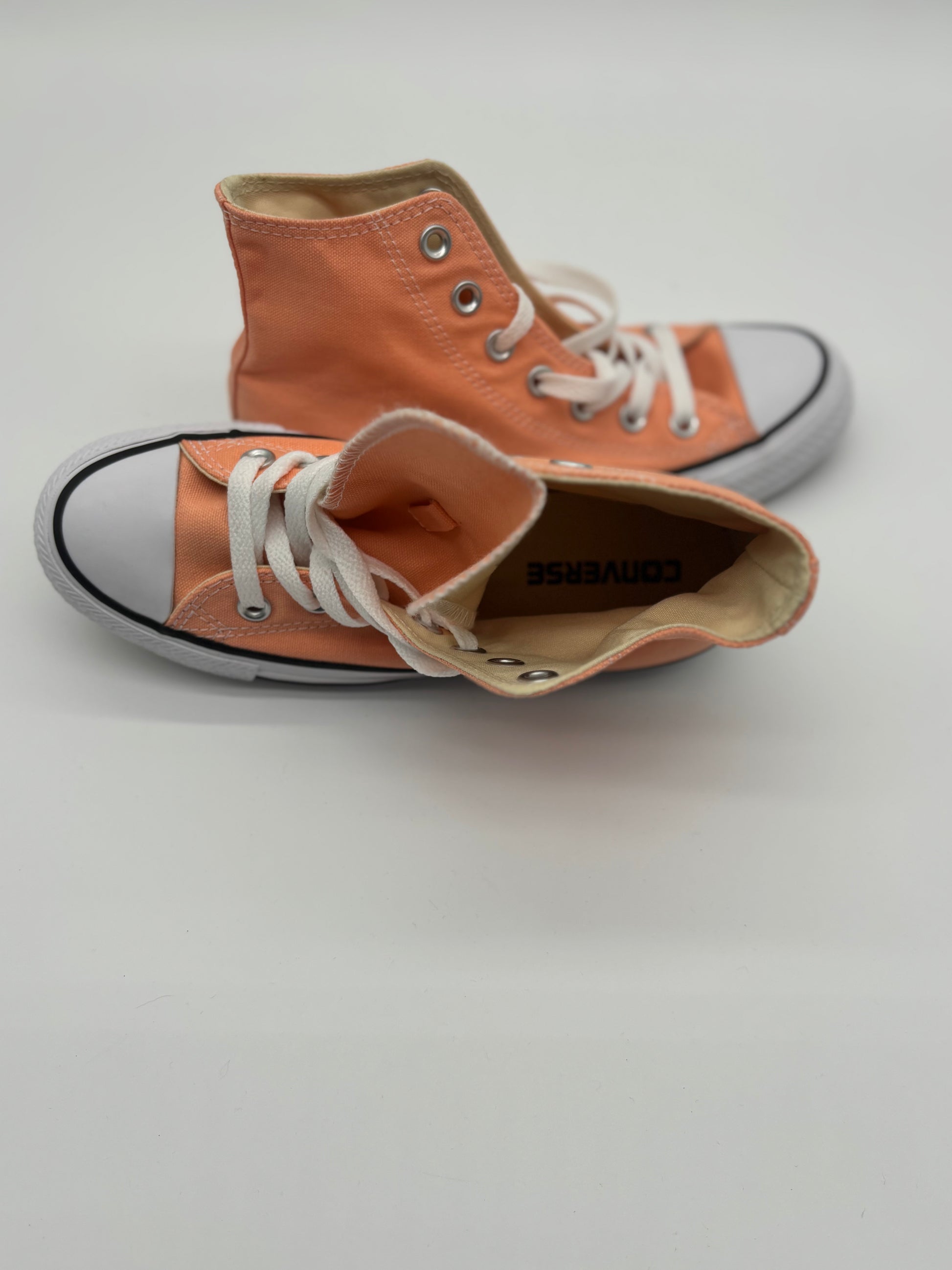 Diese klassischen High-Top Chucks bestehen aus robustem Canvas-Material in einem frischen Orangeton. Die weiße Gummisohle mit schwarzem Streifen, die verstärkte Zehenkappe und die weißen Schnürsenkel bilden einen kontrastreichen Look.