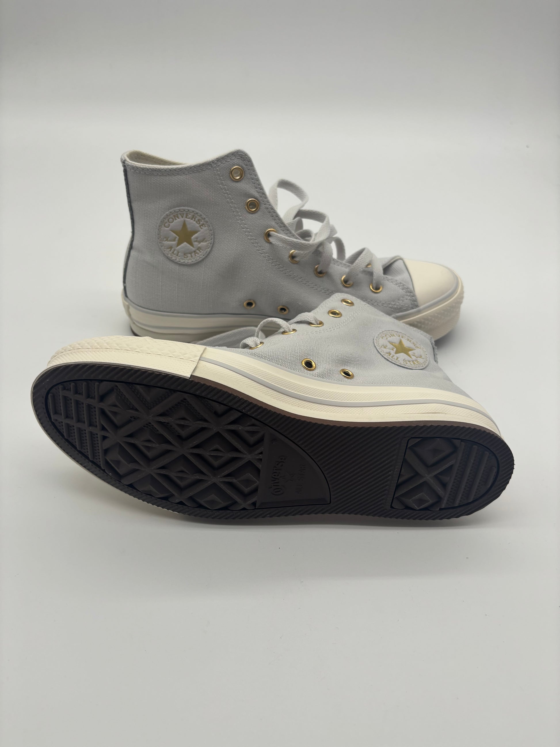 Eleganter Converse Chuck Taylor All Star High-Top in hellem Grau mit goldenen Details. Das minimalistische Design wird durch goldfarbene Metallösen und ein tonales Logo stilvoll aufgewertet. Der Schuh besteht aus robustem Canvas mit klassischer Gummikappe und Sohle. Ein moderner Twist des zeitlosen Klassikers.