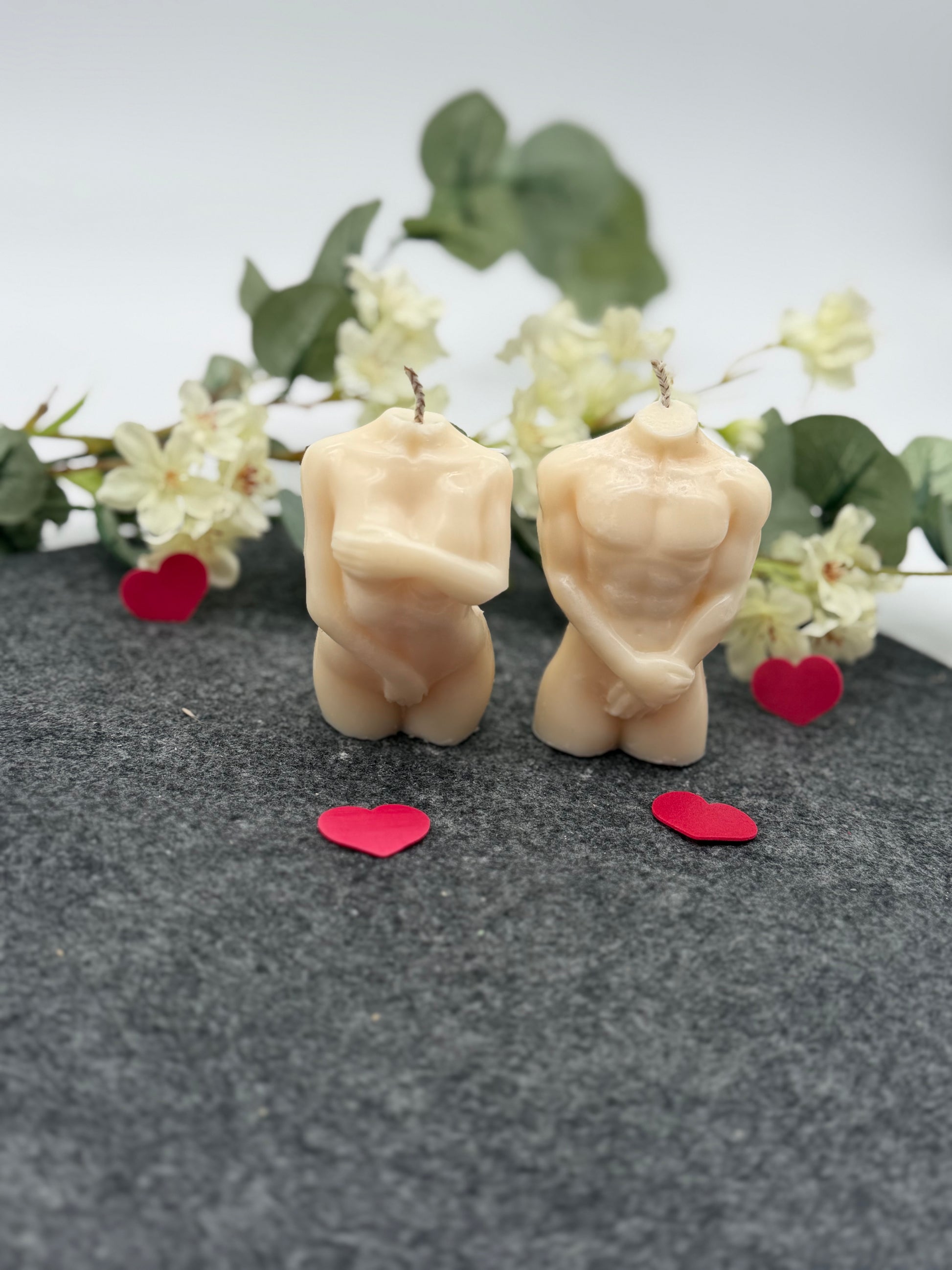 Handgegossene Körperkerzen aus natürlichem Sojawachs als stilvolles Duo mit weiblicher und männlicher Form oder auf Wunsch auch als Paar aus zwei Frauen oder zwei Männern erhältlich.
