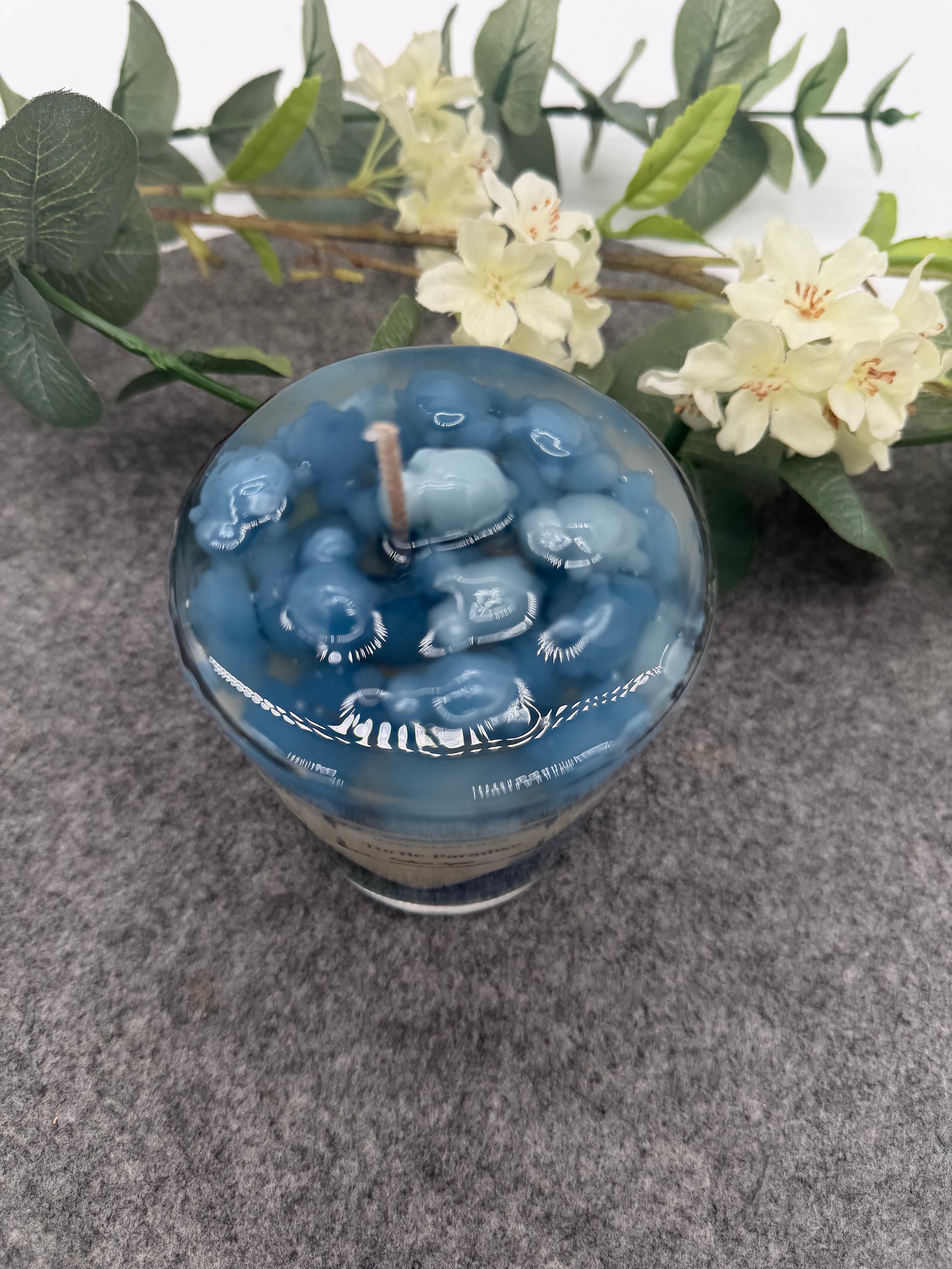 Handgemachte Sojawachskerze Turtle Paradies vereint kunstvoll geschichtete Farben in Blau, Weiß und Grün und erinnert an ein tropisches Inselparadies. Ihre detailreiche Oberfläche mit eingearbeiteten Blasen und die klare Glasform machen sie zu einem stilvollen Dekoelement mit Naturflair.