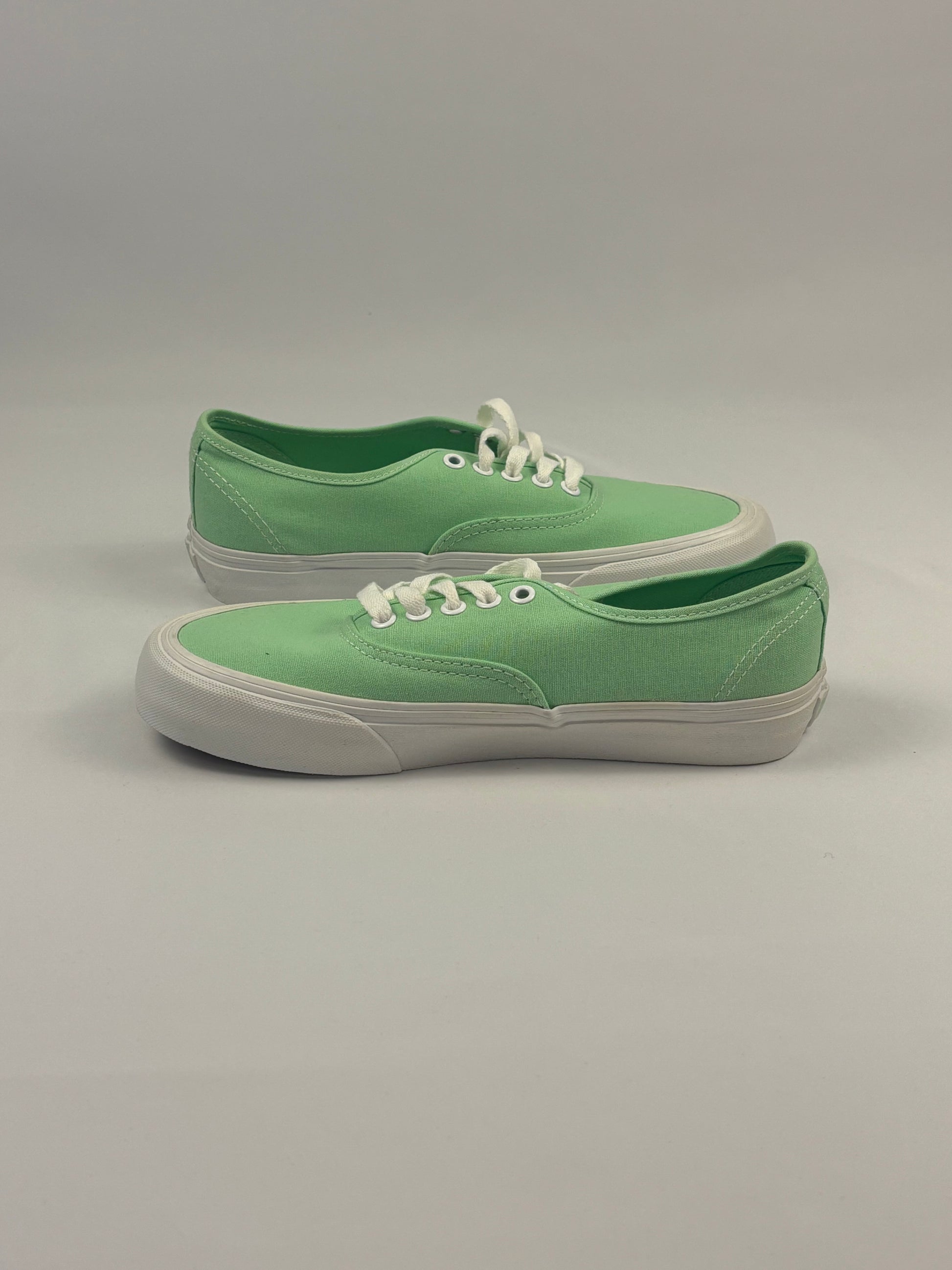 Dieser Vans Authentic kombiniert den klassischen Low-Top-Style mit einem frischen, mintgrünen Canvas und zarter Schmetterlings-Stickerei an der Ferse. Ideal für alle, die Minimalismus mit einem verspielten Detail lieben.