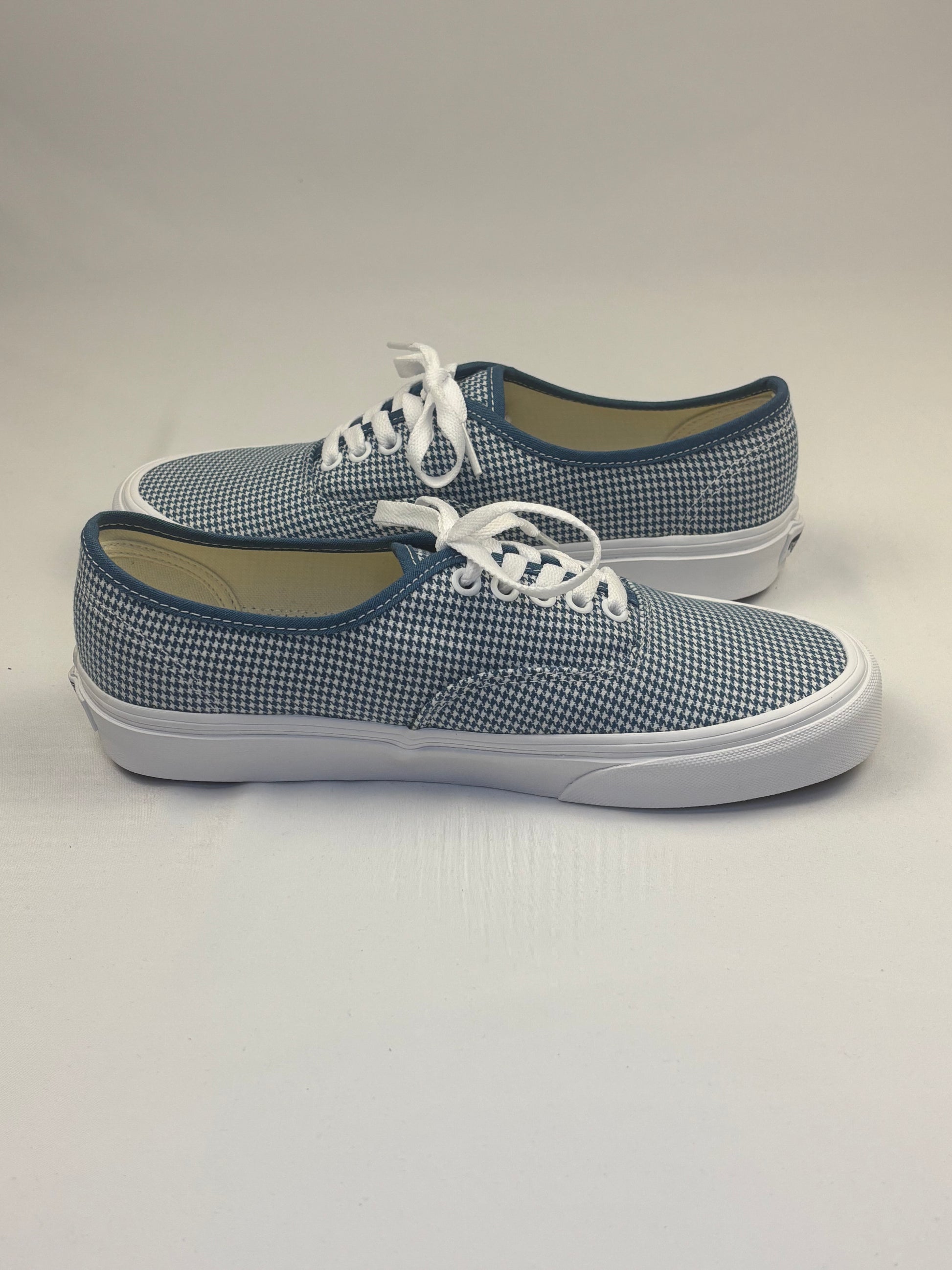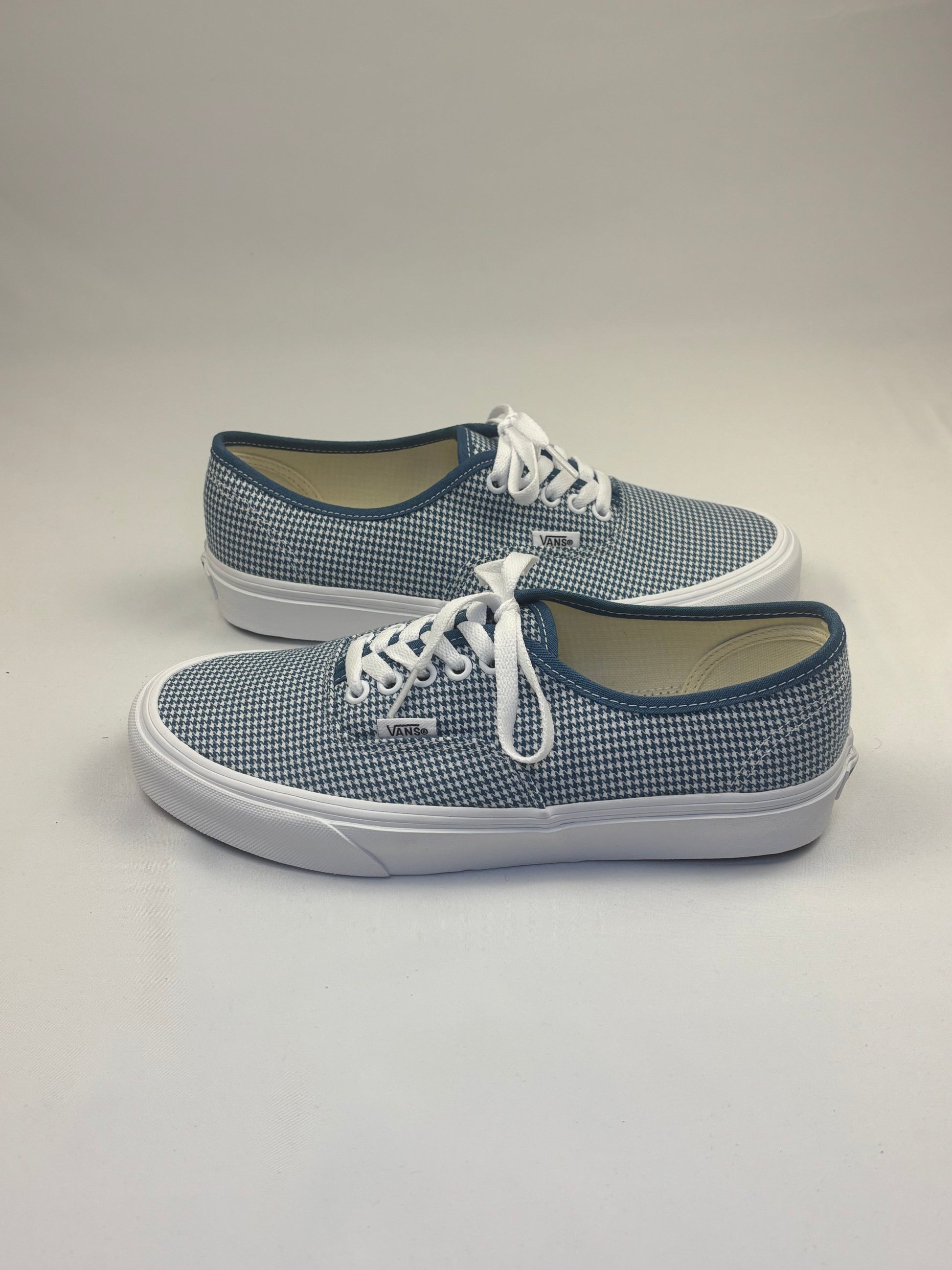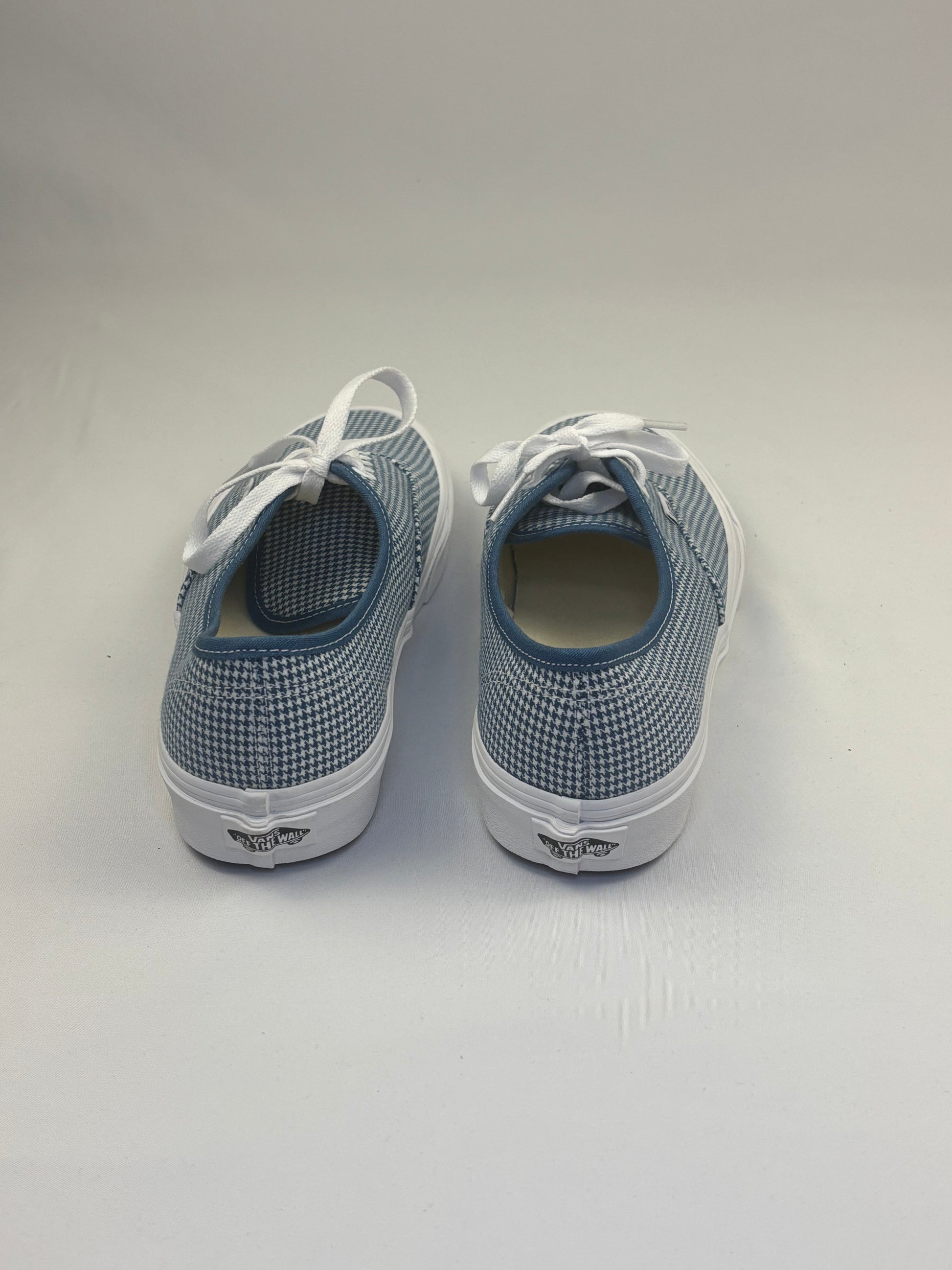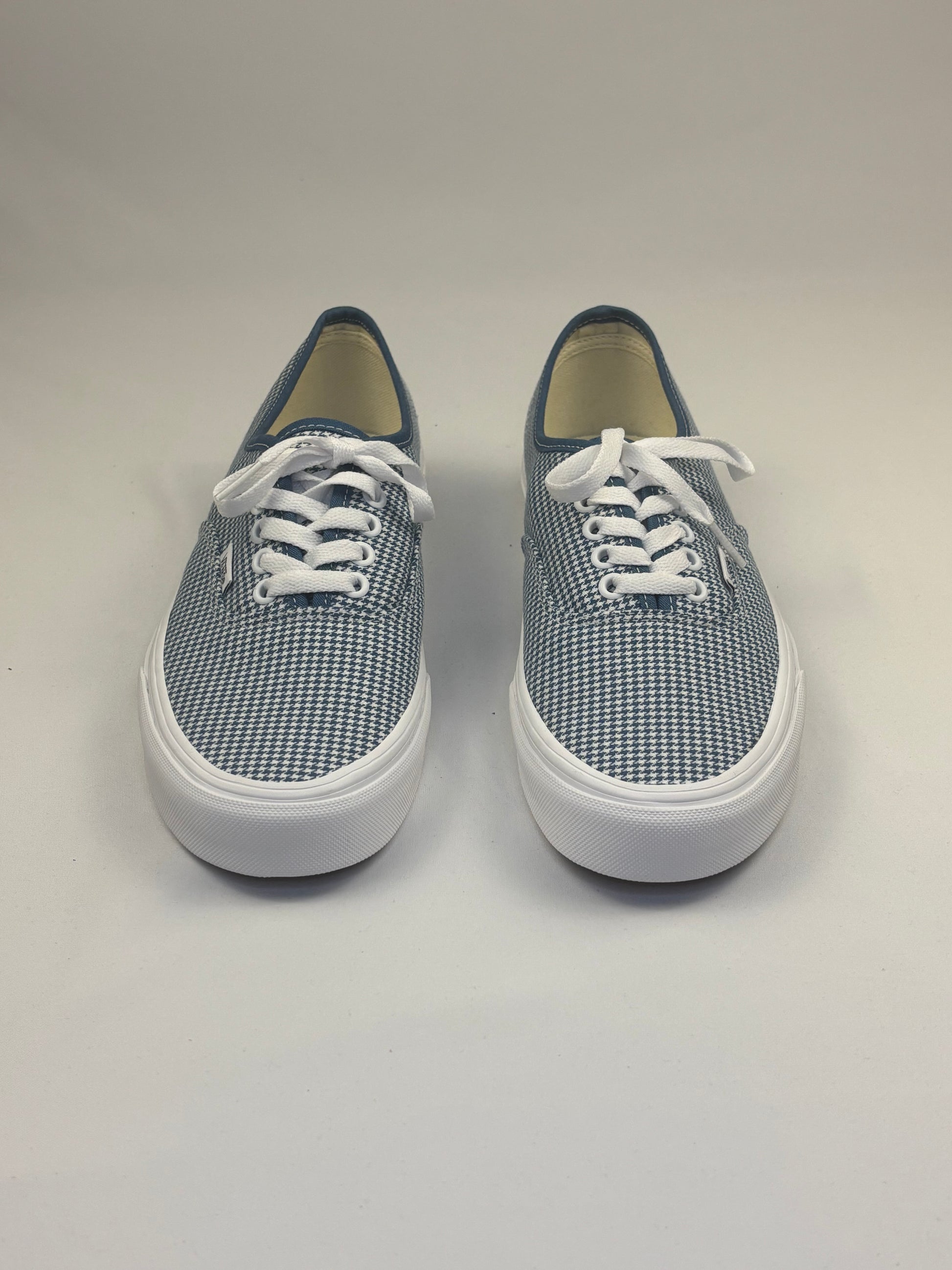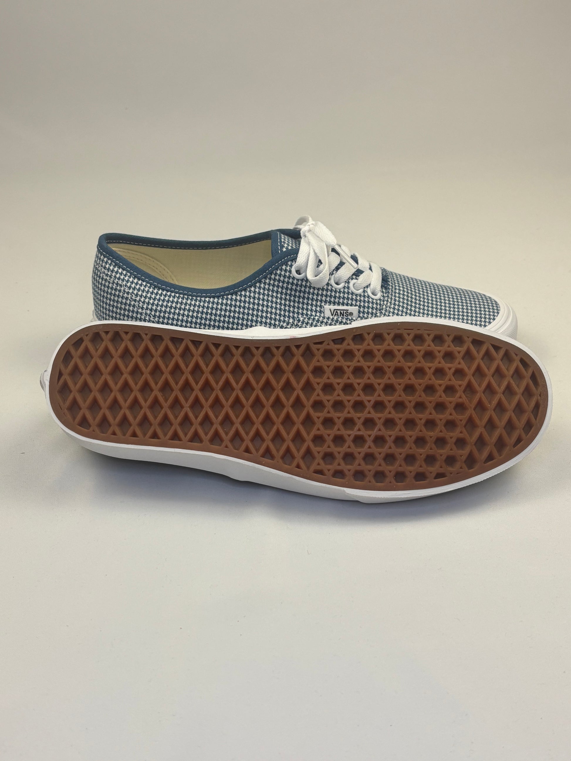Vans Authentic Sneaker setzen auf ein auffälliges, aber elegantes Design mit einem feinen Hahnentritt Muster in Blau-Weiß. Das gesamte Obermaterial besteht aus Textil mit gewebter Struktur, das dem Schuh eine besondere Optik und Haptik verleiht.