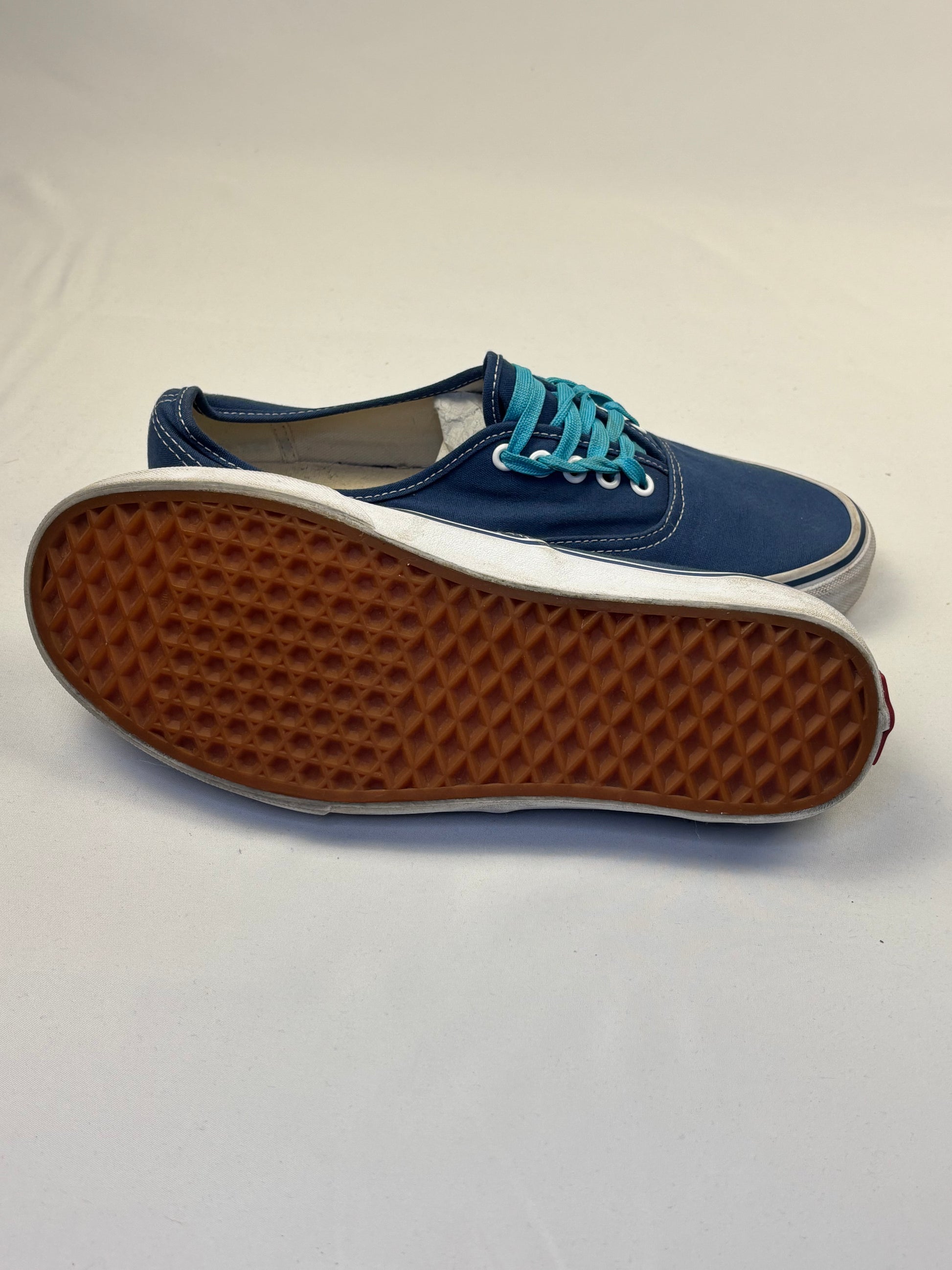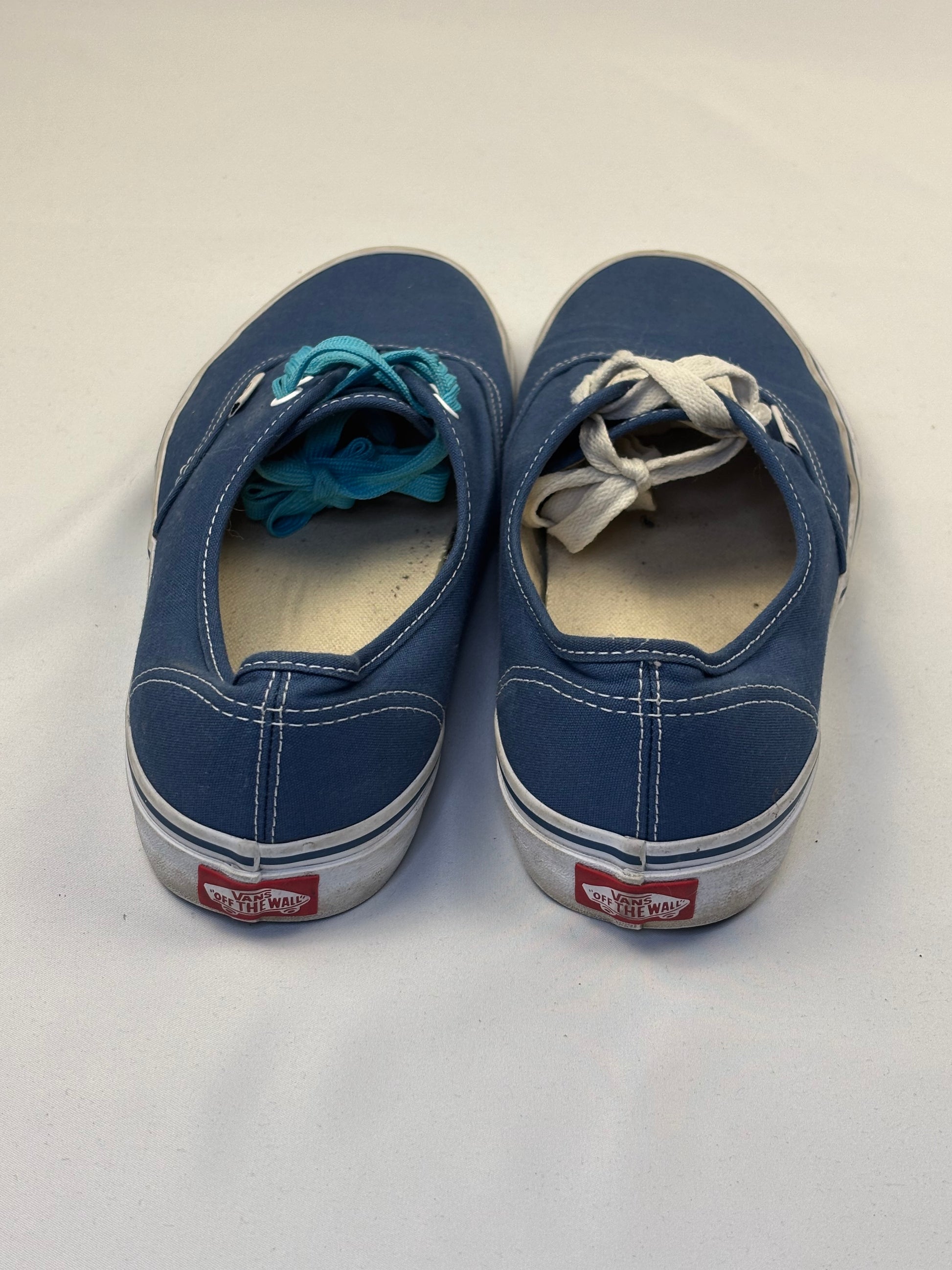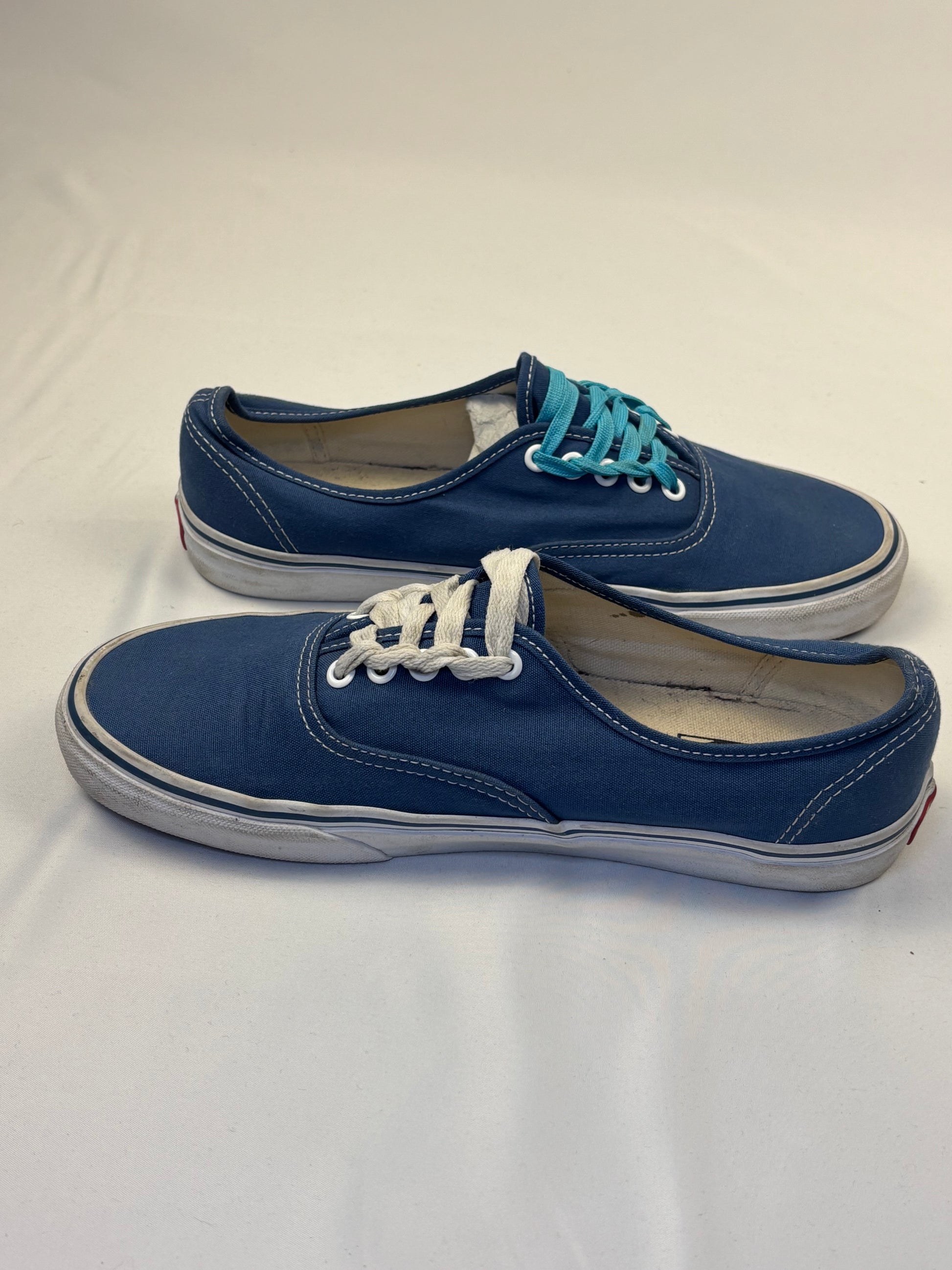 Vans Authentic Sneaker kommt in einem klassischen Dunkelblau mit einem besonderen Twist: Die Schuhe tragen unterschiedliche Schnürsenkel, einmal in Weiß, einmal in leuchtendem Blau.