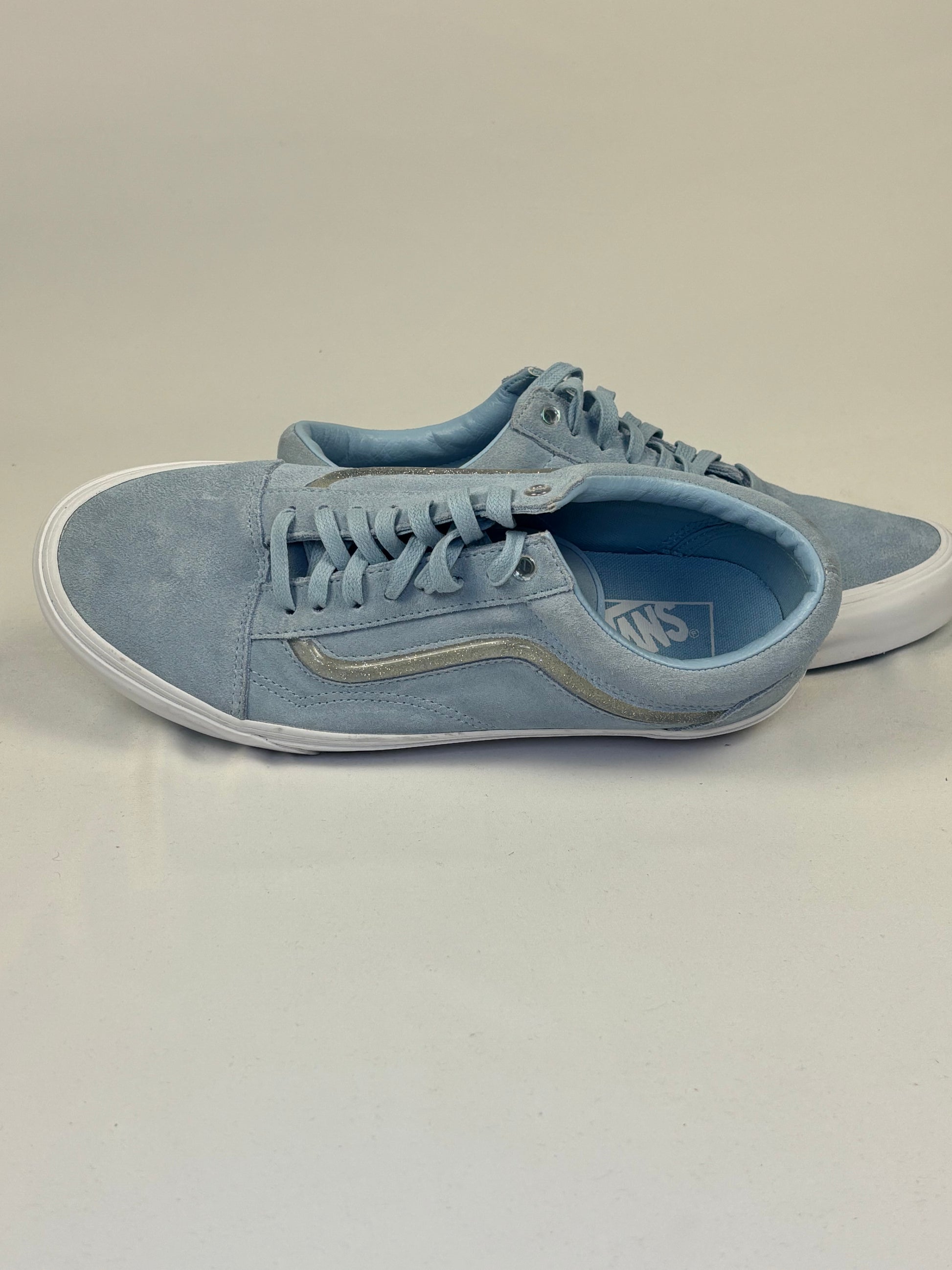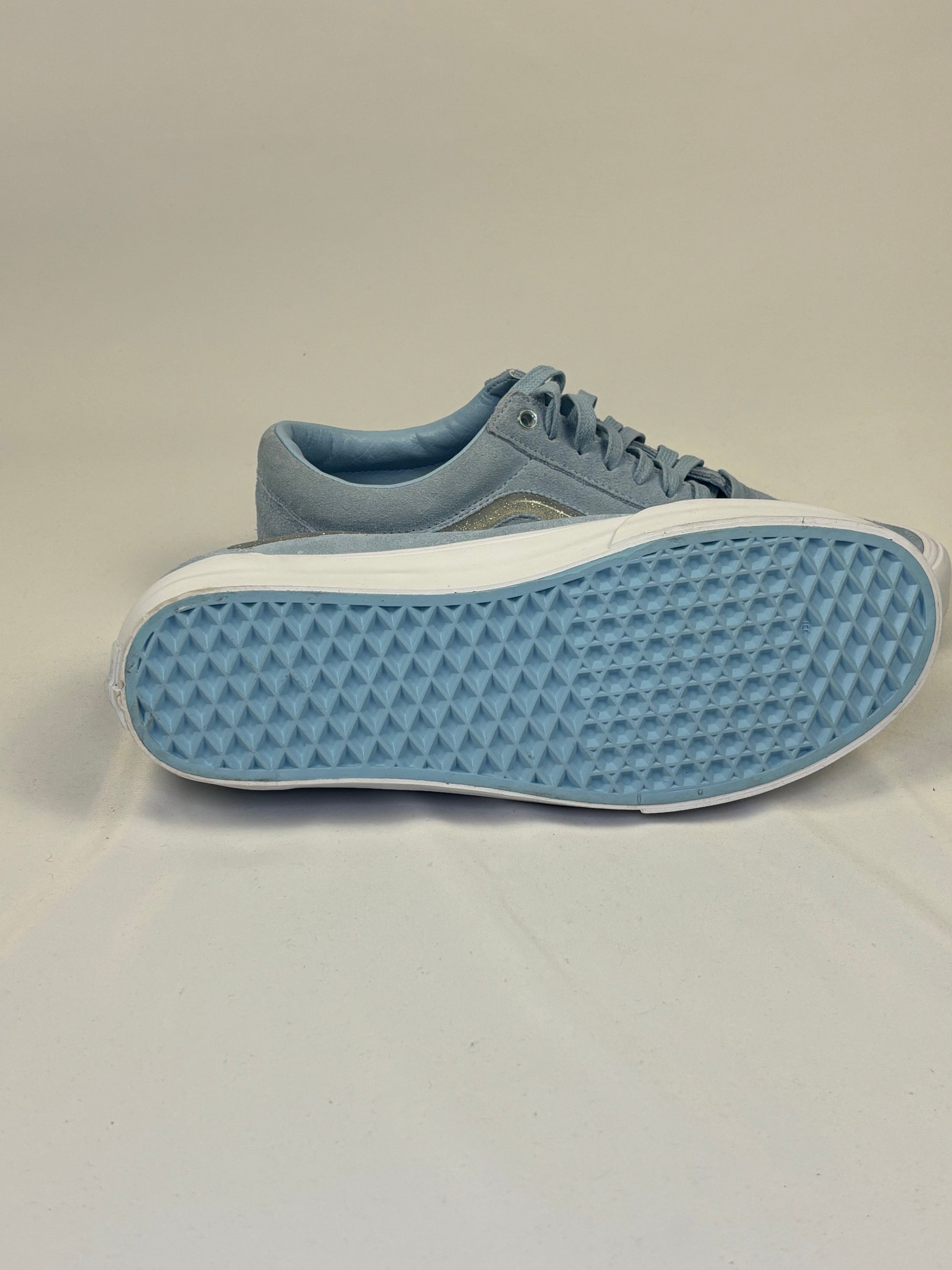 Vans Old Skool Sneaker überzeugen durch ihren monochromen Look in hellem Himmelblau. Das Obermaterial aus weichem Wildleder sorgt für eine edle, matte Optik und angenehme Haptik. Der Seitenstreifen ist leicht abgesetzt in einem graublauen Ton mit dezentem Glanz, was dem Design Tiefe verleiht.