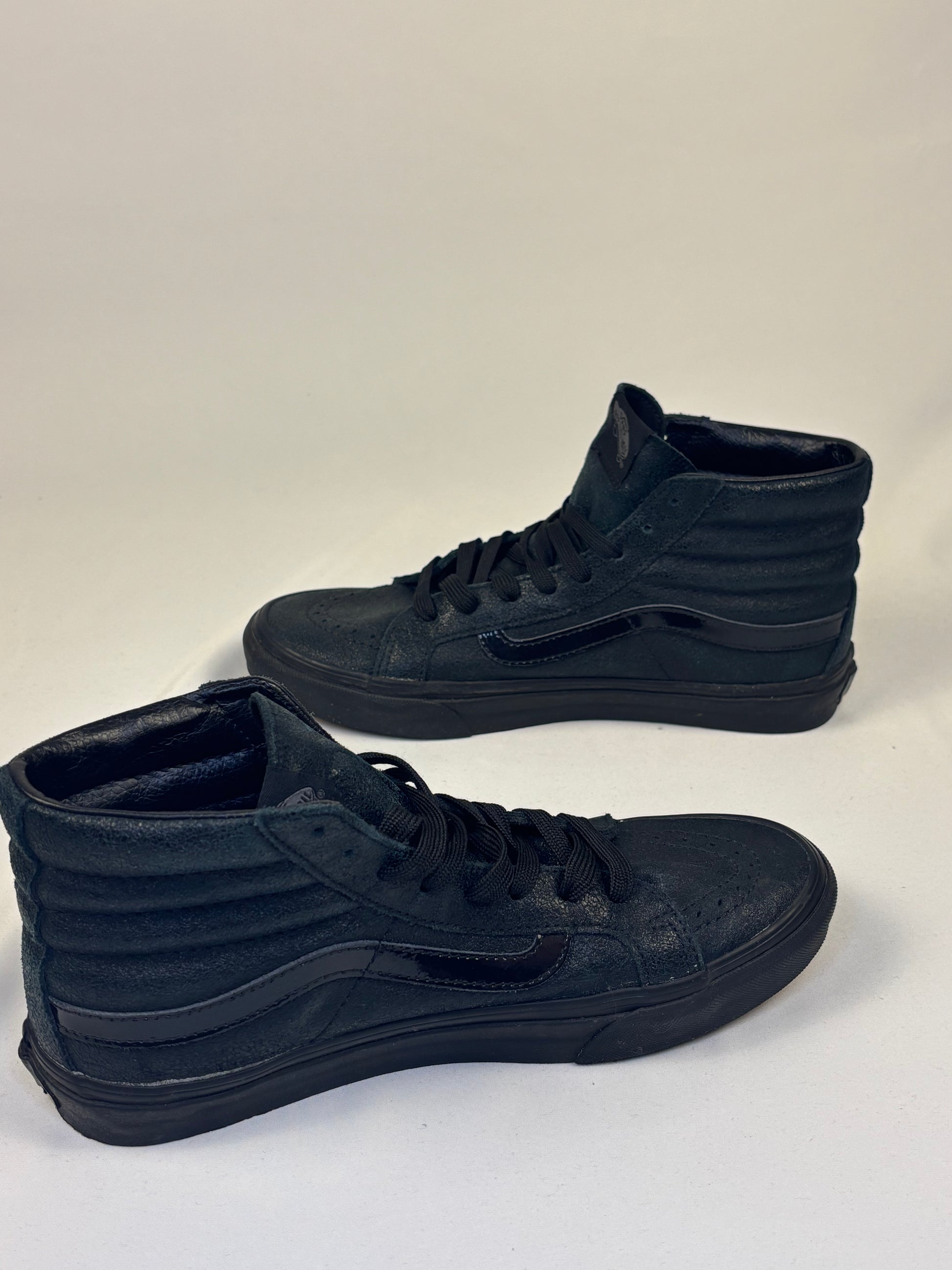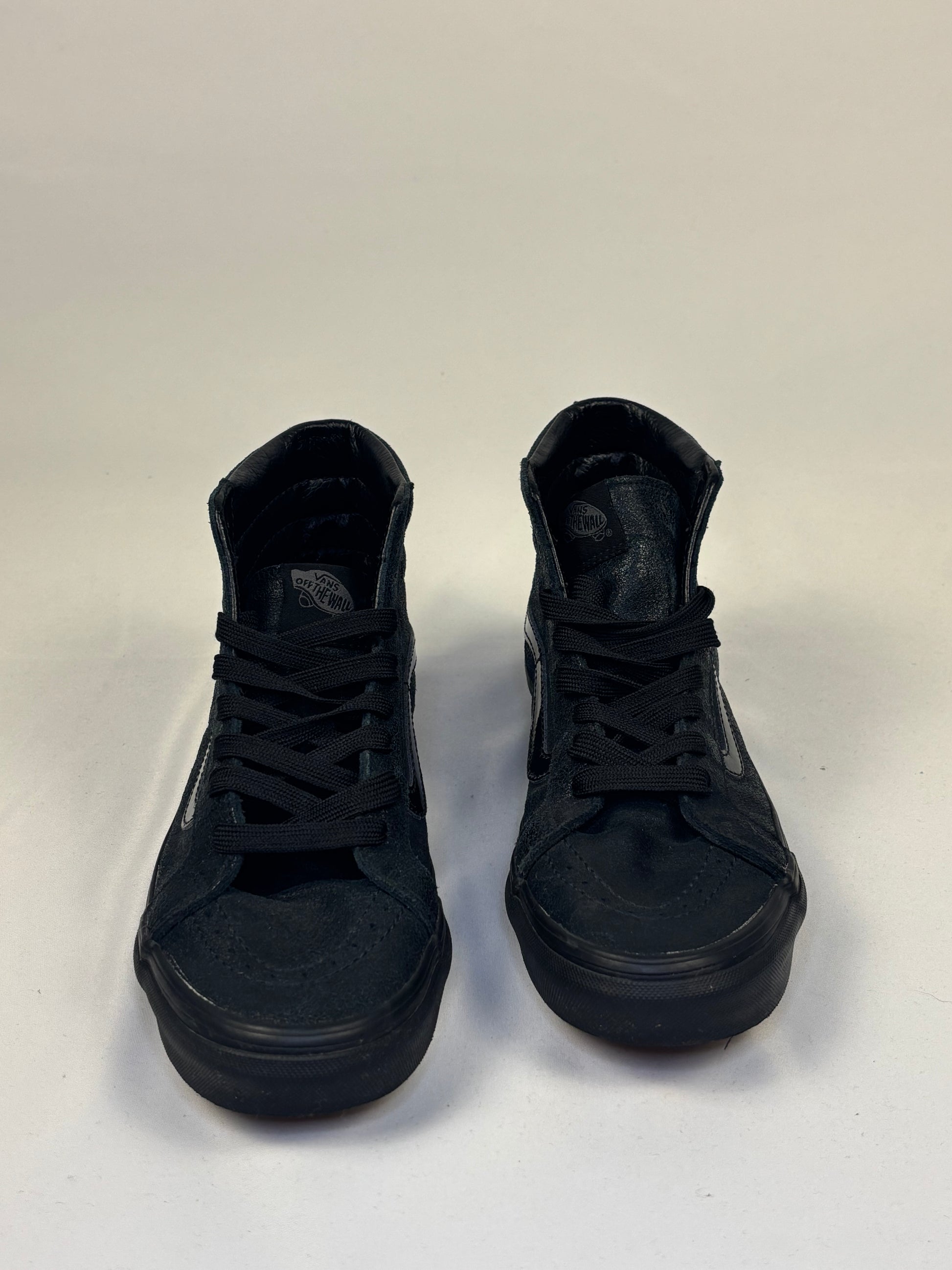 Vans Sk8-Hi Sneaker in komplett schwarzer Ausführung strahlen urbanen Minimalismus und Understatement aus. Das Obermaterial besteht aus einer Kombination aus Wildleder und strukturiertem Canvas.