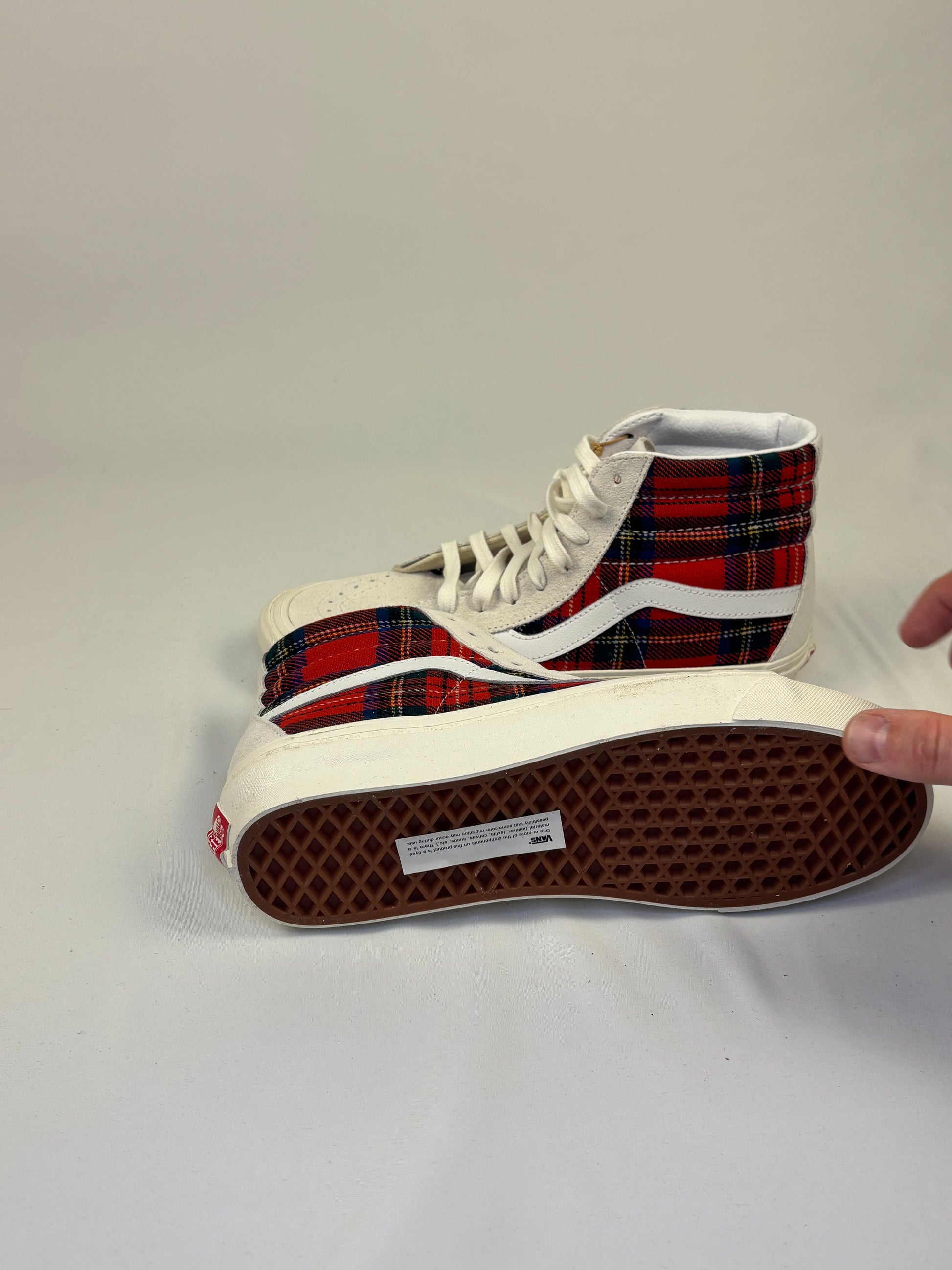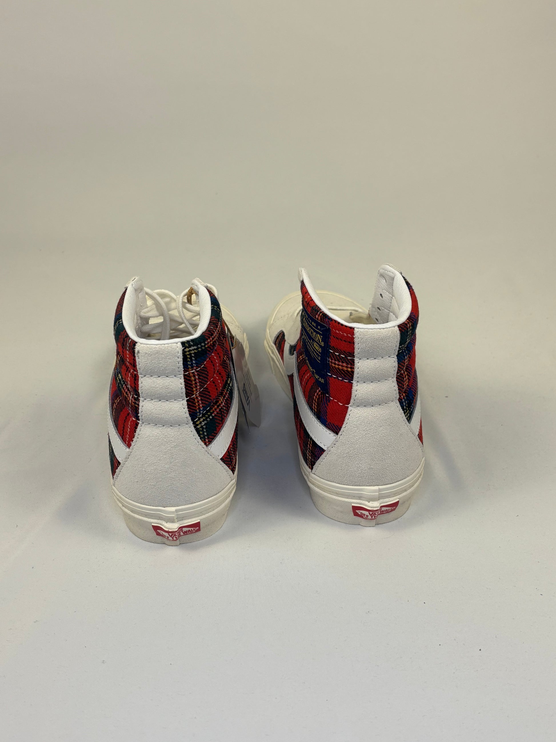 Vans Sk8-Hi Sneaker sind Teil der exklusiven Zusammenarbeit mit Pendle Ton Wohlen Miliz. Das auffällige Design kombiniert hochwertiges weißes Wildleder mit klassischen karierten Wollpaneelen im „Royal Stewart Tartan“-Muster in Rot, Blau, Grün und Gelb.